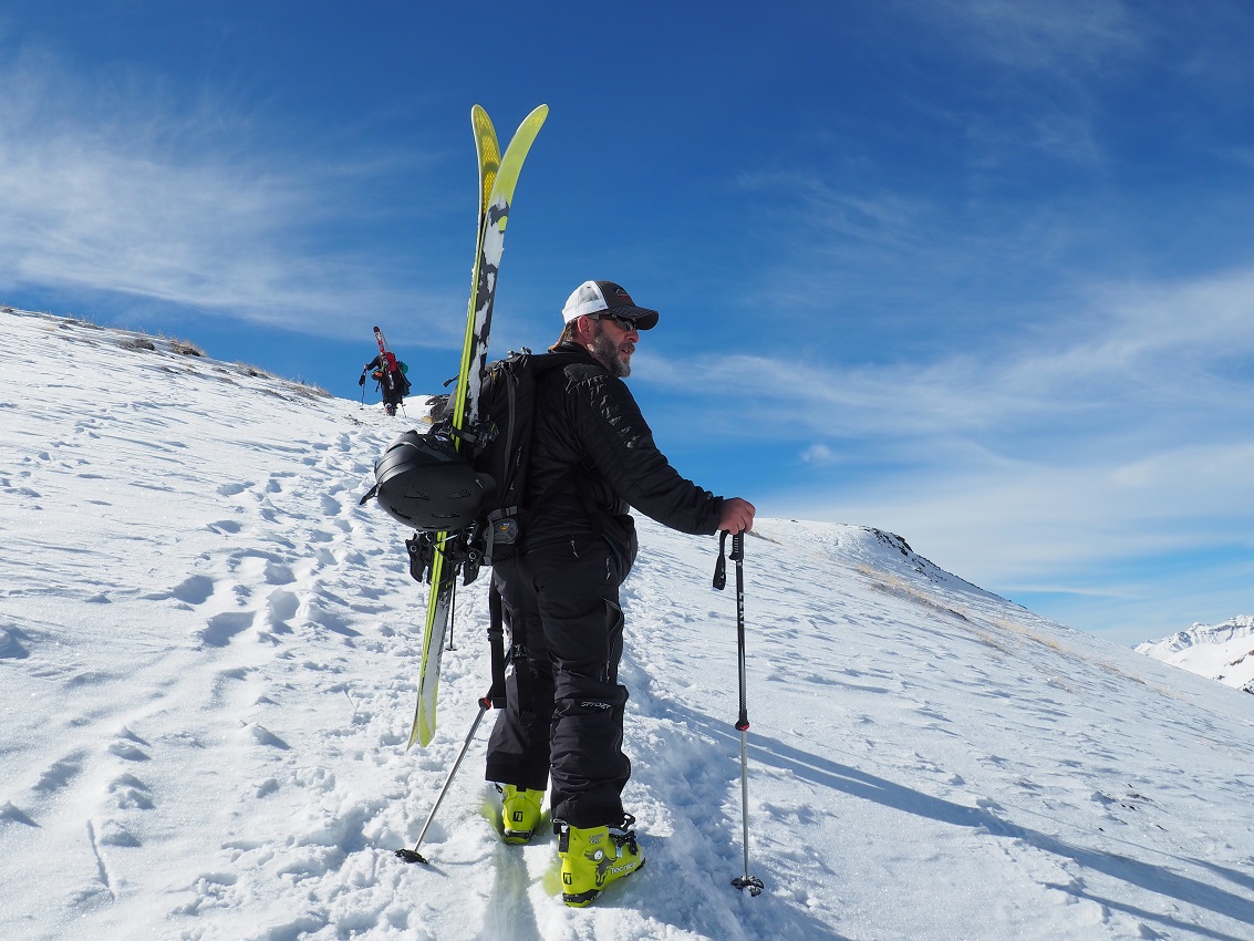 We've been hearing about Silverton Mountain for a number of years: Good as Alta, only better; more vert than your legs can handle; terrain so steep you can't ski it without a guide. In the event, it was quite good, but a lot of work for the turns. Some of the work is being done by Benson in the picture above. And some of the work is being done by Benson in the picture below. The terrain was spectacular, but the conditions were mixed. On the other hand, between the hiking and the thrashing it tired us out. It really did. As tired as Alta anyway. More pics.