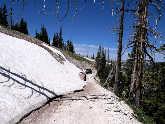 The pair of feds among us had a holiday yesterday. We decided to meet up to explore two or three areas on the boundary between the MLS and the Fishlake. In the event, we reached just one of them. On our way to the second, we got near the pass above Emerald Lake on Skyline Drive before we ran into this snowbank (above). EDO started digging (and we probably could have cleared it) but it would have used up most of the rest of the afternoon, so we decided to back down. Before leaving though, EDO noticed another Chev about 300 feet below us on the slope. We slithered down to have a look. It has probably been their for 20 years or more. What we decided was that "probably these dumb shits were trying to do what we've been trying to do:" Drive over a snow bank on a narrow road above an 800-foot drop.